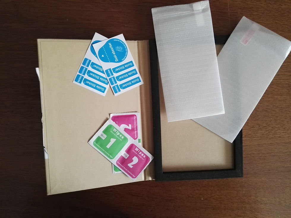 Una volta aperto, all'interno troviamo due pellicole contenute dentro un piccolo sacchetto in materiale sintetico poliespanso, che protegge la pellicola da graffi accidentali e urti, due sacchettini chiusi ermeticamente contenenti le salviette umide e secche per la pulizia del vetro del telefono e infine due adesivi togli polvere e impronte e degli adesivi per accompagnare il vetro nella posizione ottimale sul vetro touch.